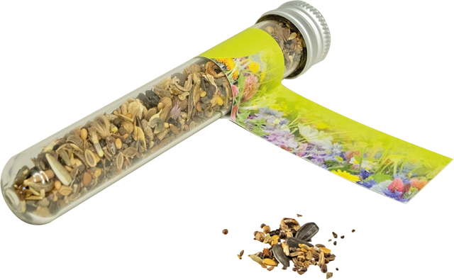 Beschreibung: Bereiten Sie den Bienen einen gedeckten Tisch mit dieser ausgesuchten bienenfreundlichen Samenmischung. Das Reagenzglas kann anschließend für die Aufbewahrung von Kräutern oder Salz in der Küche dienen. Das Fähnchen bietet im Standardmotiv Platz für Ihren Werbeeindruck oder, ebenfalls ab 250 Stück, für Ihre individuelle Gestaltung.