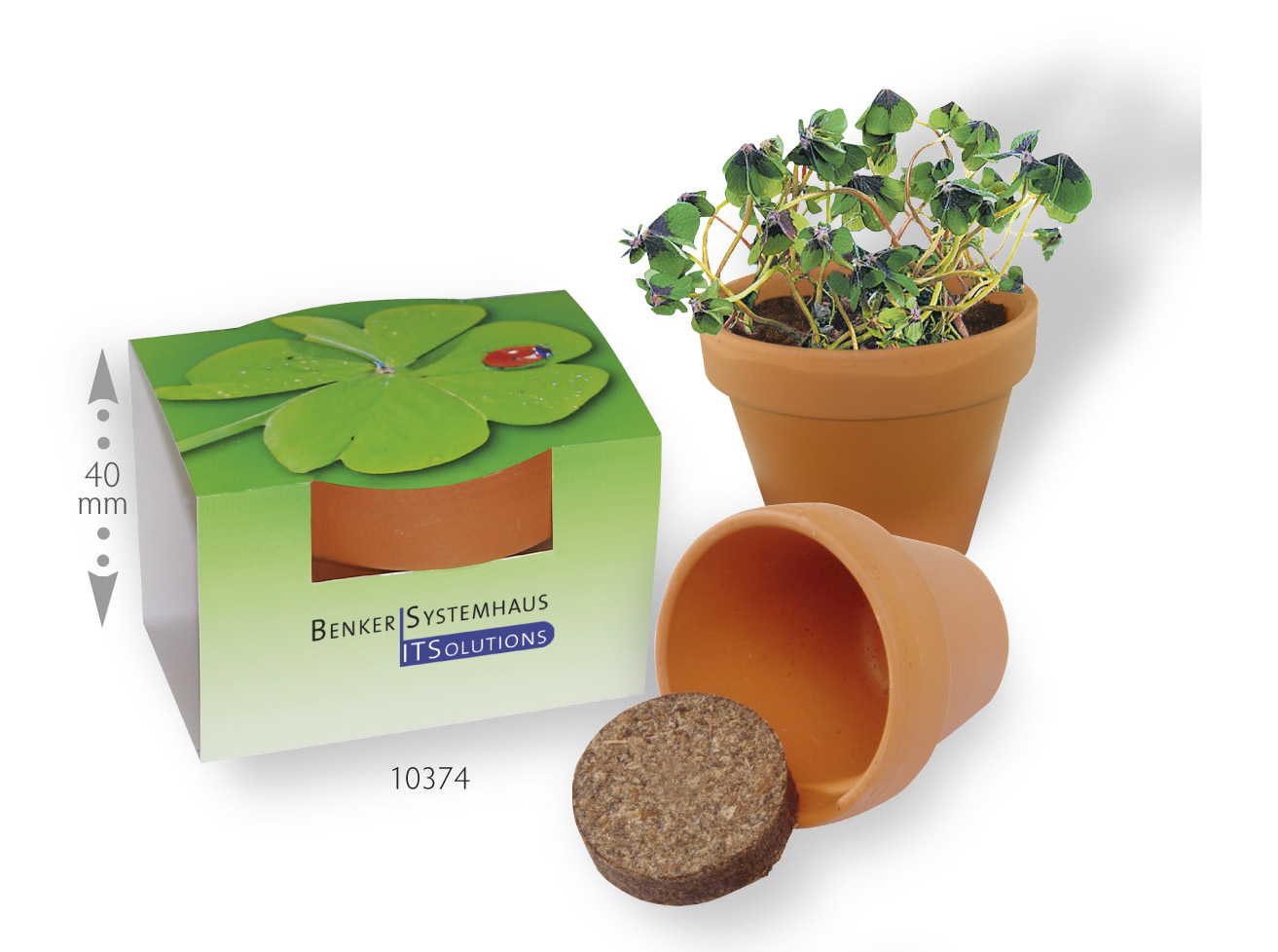 Inhalt: Tontöpfchen Ø 4 cm, Erdtablette, Glückskleezwiebelchen