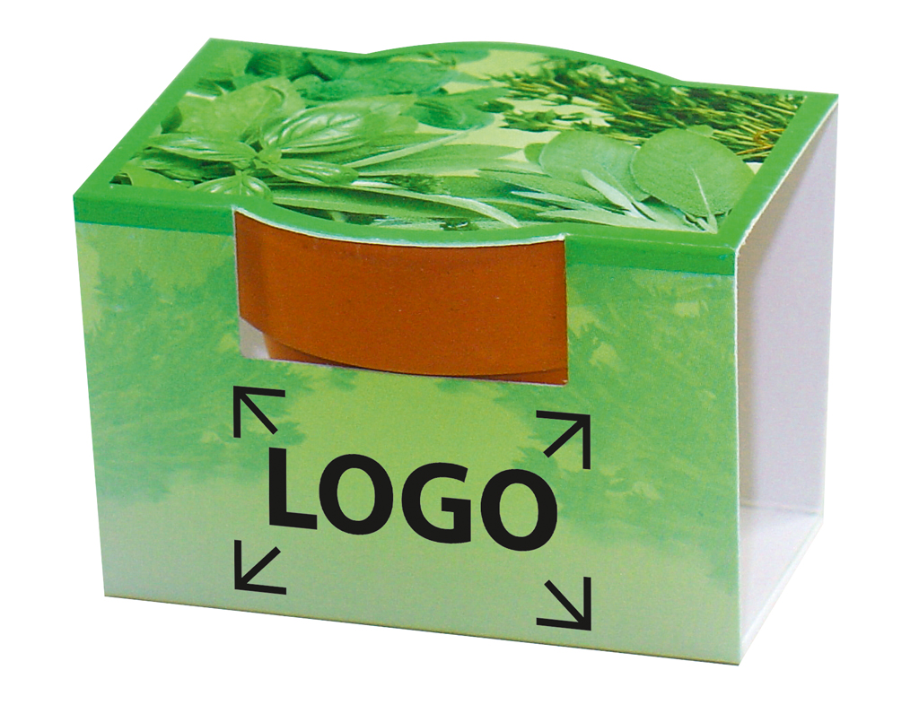 Beschreibung: Blumig, sonnig, frisch. Das kleine Tontöpfchen mit Erdtablette und Kräuter-Samen. Die Banderole bietet auf der Vorderseite einen sichtbaren Platz für Ihre Werbebotschaft. Direkt auf dem Tontöpfchen ist ein Aufdruck im Tampondruck möglich. Eine Gestaltung der Banderole ab 250 Stück.