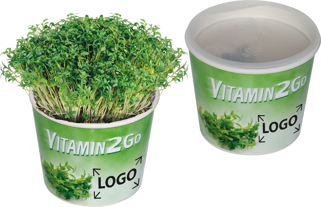 Beschreibung: In dem kleinen Becher ist alles enthalten für die Anzucht der Kresse-Pflanzen. Andere Samensorten sind möglich, nach Ihren Aktionsthemen und Wünschen. Platz für Ihre Werbung ist auf dem Standardmotiv der Becherbanderole oder eine eigene Gestaltung, jeweils ab 250 Stück.