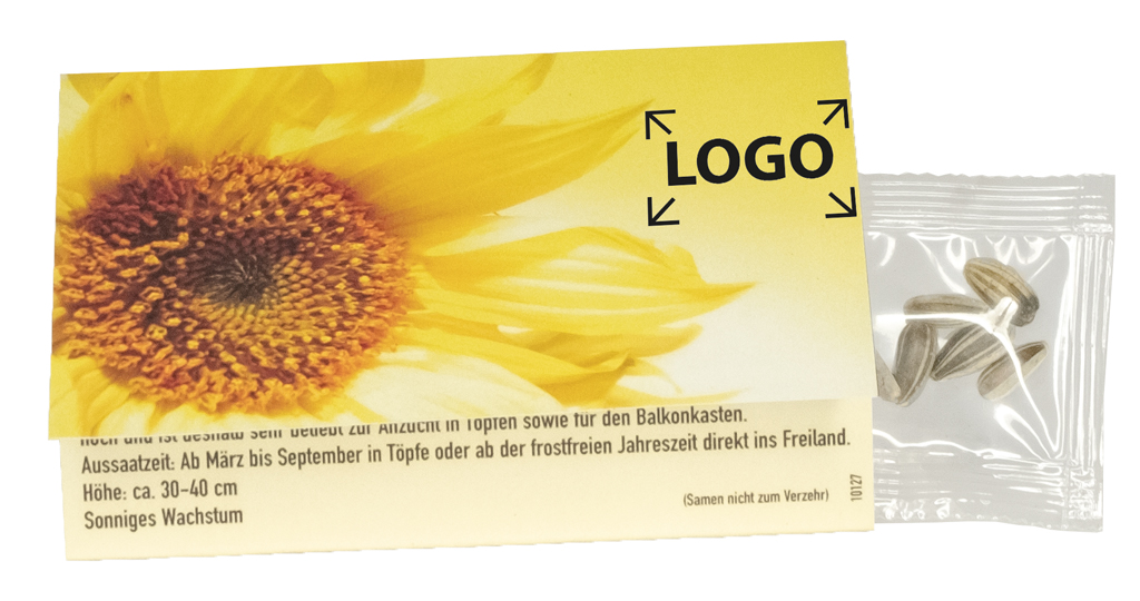 Beschreibung: Die ideale Beilage für Ihre Werbebotschaft. Verschiedene Standardmotive und Samensorten stehen zur Auswahl. Mit dieser Karte haben Sie, mit Ihrer eigenen Gestaltung der Vorder- und Rückseite (außen), einen preiswerten Mailingbegleiter. Die Samentüte wird innen eingelegt und Sie können die Sorte der Samen, passend zu Ihrer Werbeaussage und Jahreszeit, selbst wählen. Der Druck erfolgt in das Standardmotiv oder eine eigene Gestaltung, jeweils ab 250 Stück. Samen: Zwergsonnenblume