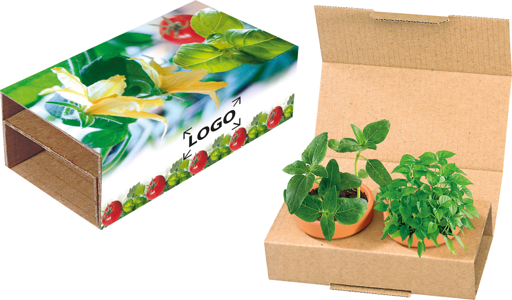Beschreibung: Zwei Tontöpfchen jeweils Ø 4 cm im Naturkarton geschützt eingebettet mit Erdtabletten und Samen. Ein würziges Basilikum-Tomaten Duo. Für den Werbeaufdruck ist Platz auf der Vorderseite. Zur eigenen Gestaltung nach Ihren Themen und Samenwünschen bietet sich die Banderole an, ab 250 Stück.