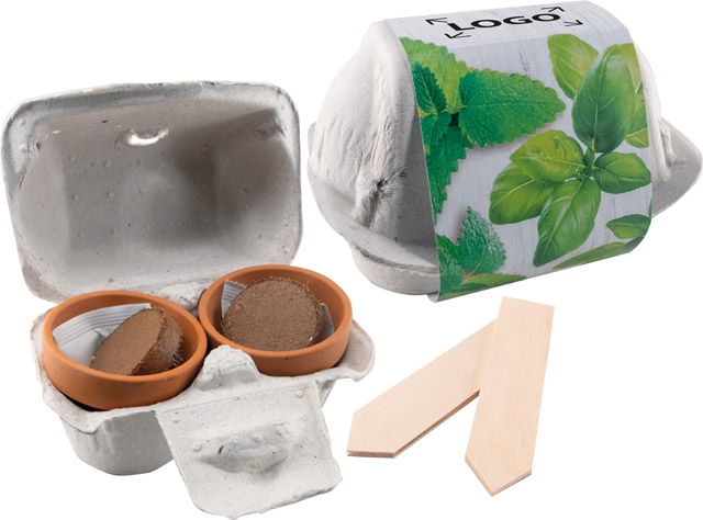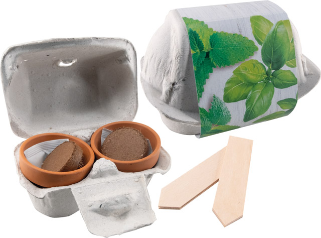 Inhalt: 2 Tontöpfchen Ø 4 cm, 2 Holzstecketiketten,Erdtabletten, Samen: Basilikum, Zitronenmelisse