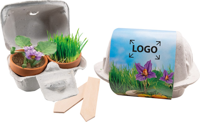Beschreibung: Ein wachsendes Duett zu Ostern. In der nachhaltigen Eierpackung aus Altpapier befinden sich Tontöpfchen, Erdtabletten und Samen des Eierbaums und Weizengras. Die Banderole bietet viel Platz für Ihre Werbebotschaft oder, ebenfalls ab 250 Stück, für Ihre individuelle Gestaltung.