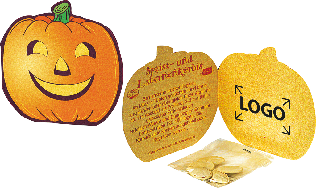Beschreibung: Ende Oktober, wenn die Ernte eingefahren ist, gibt es die besondere Möglichkeit zu danken. Ein Kult aus früherer Zeit, der jetzt Europa erobert hat. Sagen Sie auch Danke zu Ihren Geschäftspartnern. Dieses Klappkärtchen als Giveaway zum Überreichen mit Kürbiskernen für die Aussaat Ihres eigenen Kürbisses für das nächste Fest. Werbefläche bietet die Innenseite der Karte auf dem Standardmotiv oder eine eigene Gestaltung, jeweils ab 500 Stück.