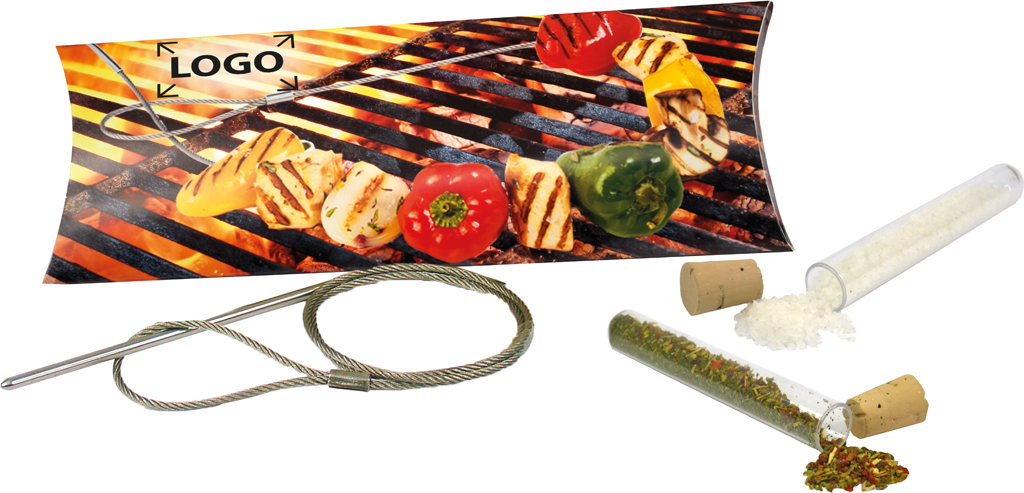 Beschreibung: Unsere BBQ-Box enthält Grillkräuter und Meersalz für die deftige Zubereitung von Speisen. Speziell zum Grillen oder Braten in der Pfanne ist ein Grilldraht enthalten, auf dem sich leicht Fleisch oder Gemüse aufspießen lassen und der nach dem Gebrauch wiederverwendbar ist. Alles ist schön und handlich verpackt in der Geschenk-Box. Platz für den Werbedruck ist auf dem Standardmotiv der Packung oder eine eigene Gestaltung der Packung, jeweils bereits ab 100 Stück.