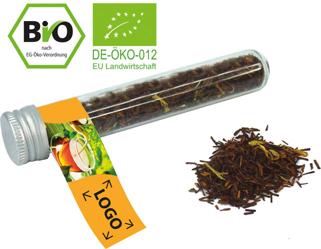 Beschreibung: Die harmonisch abgestimmte Rooibusch Bio-Tee-Mischung im Reagenzglas reicht für zwei Tassen schmackhaften Tee. Der Werbedruck erfolgt auf dem Standardmotiv oder eine eigene Gestaltung des Fähnchens, jeweils bereits ab 250 Stück möglich. Zertifikat: Bio Siegel EU