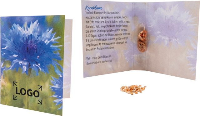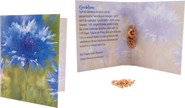 Beschreibung: Die vegane, wasserlösliche Kapsel enthält Samen der Kornblume. Erfreuen Sie Ihre Kunden mit dieser blauen Blütenpracht in der unkonventionellen Verpackung. Eine Werbeanbringung auf dem Standardmotiv oder die individuelle Gestaltung der Karte ist bereits ab 250 Stück möglich.
