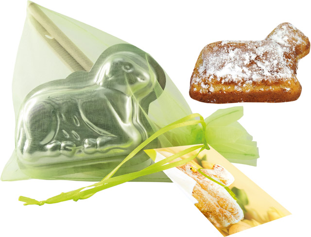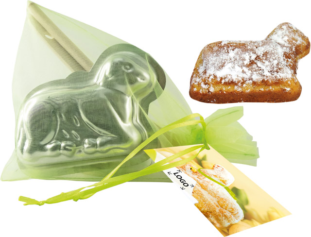 Beschreibung: Ein Backförmchen Lamm mit Rührlöffel und Backpinsel, schön verpackt im Organzasäckchen. Ein österliches Backrezept finden Sie auf dem Anhängekärtchen. Das Standardmotiv bietet genügend Platz für Ihren Werbeaufdruck. Eine eigene Gestaltung des Kärtchens ist bereits ab 100 Stück möglich.