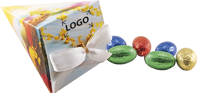Beschreibung: Eine kleine Tüte für Schokoladenfans. Passend zu Ihrer Werbeaktion in der Osterzeit ist die Spitztüte mit Schokoladeneiern gefüllt. Wir wünschen süße Ostern! Ihr Logo im Standardmotiv oder eine individuelle Gestaltung der Spitztüte kann bereits ab 250 Stück umgesetzt werden.