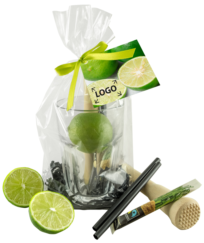 Inhalt: Cocktail-Glas, Holzstößel, 2 Rohrzuckersticks (je 5 g), 2 Trinkhalme schwarz, frische Limette, Rezeptkärtchen