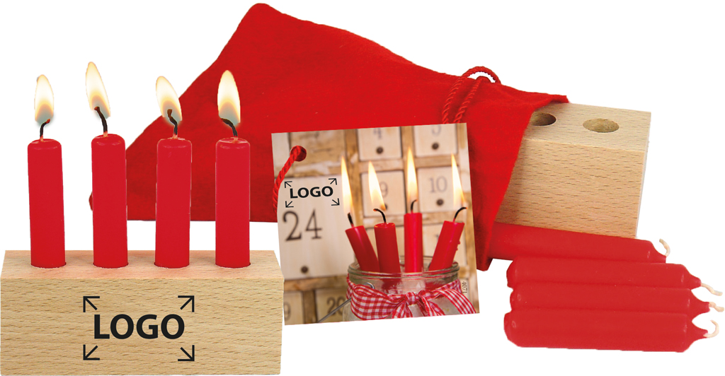 Inhalt: Kerzenhalter aus Holz, 4 rote Adventskerzen (ca. 70 mm)