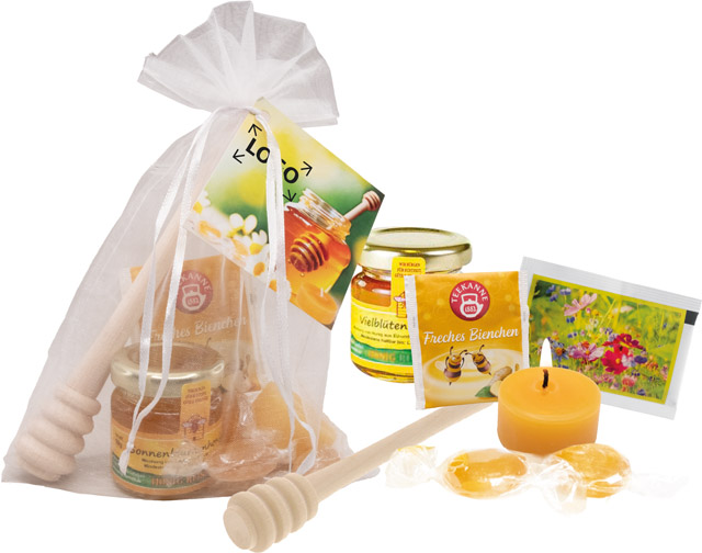 Beschreibung: Mit unserem Set werden Ihre Kunden zu Bienenfreunden. Das hübsche Organzasäckchen enthält ein Gläschen Honig, einen Honigheber aus Holz, ein Bienenwachs-Teelicht, Honigbonbons, Früchtetee und Bienenwiesensamen. Das Anhängekärtchen kann ab 100 Stück mit Ihrem Logo versehen oder individuell gestaltet werden.