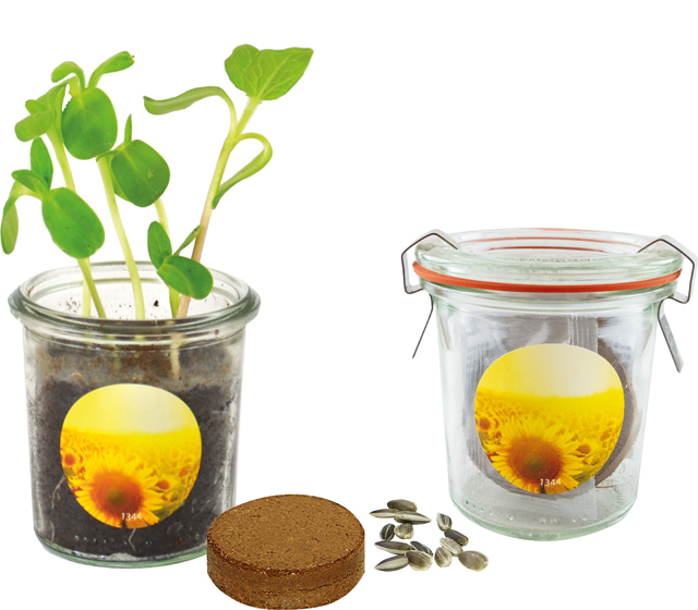 Beschreibung: Ein hübsches Glas voller Sonne. Verleihen Sie Ihrer Werbebotschaft einen Hauch von Sonne mit unserem Gläschen, der darin enthaltenen Erdtablette und dem Samen der Zwergsonnenblume. Ihr Logo findet Platz auf dem Standardmotiv. Eine individuelle Gestaltung des Etiketts ist ebenfalls ab 250 Stück möglich.