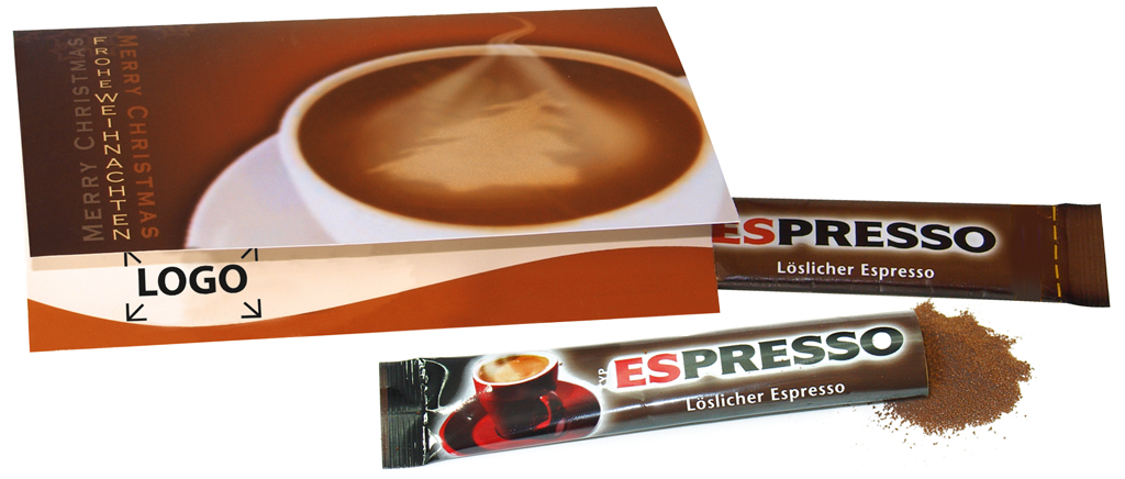 Beschreibung: Ein Klappkärtchen mit einem Stick löslichen Espresso (2 g Portionsstick) für 1 Tasse in der Kaffeepause. Platz für den Werbedruck ist auf dem Standardmotiv oder eine eigene Gestaltung der Karte, jeweils ab 250 Stück.
