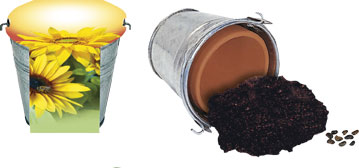 Inhalt: Zinkeimerchen 10,5 cm, Tontopf Ø 9 cm, Erdtablette, Samen: Zwergsonnenblume