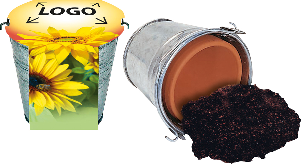Beschreibung: Das Zinkeimerchen enthält Tontopf, Erdtablette und Sonnenblumensamen für die sonnigen Ereignisse. Platz für den Werbeaufdruck ist auf der Standardbanderole. Eine eigene Gestaltung der Banderole ist ebenfalls ab 250 Stück möglich.