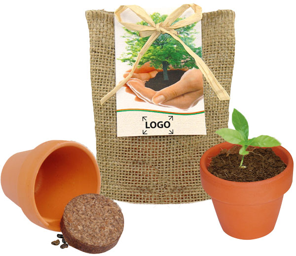 Beschreibung: Ein Stück Natur im Jutesäckchen mit Tontopf, Erdtablette und Baumsamen. Die Robinie wird gerne an Straßenrändern gepflanzt, da er sich günstig auf die CO2 Emission auswirkt. Ein sehr robuster und widerstandsfähiger Baum, mit weißen Blütentrauben und einer lichten Krone. In der ersten Wachstumsphase ist die Robinie als Pflanze für den Balkonkasten oder Kübel gut geeignet. Schnelles Wachstum, im ersten Jahr ca. 20-30 cm. Ausgewachsen ist die Robinie nach 50 Jahren und kann eine Höhe von ca. 30 m erreichen. Für den Werbeaufdruck ist Platz auf dem Standardmotiv im Header oder eine eigene Gestaltung des Headers, jeweils ab 250 Stück.