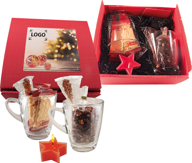 Beschreibung: So können Ihre Kunden eine besondere weihnachtliche Teestunde zu zweit genießen. Unser Set Tea For Two beinhaltet zwei Glastassen, zwei Kandisstangen, geschmackvollen Weihnachts-Früchtetee, leckere Butterspekulatius-Kekse sowie ein hübsches Sternlicht. Das Etikett im Standardmotiv kann mit Ihrem Logo versehen oder, ebenfalls ab 100 Stück, individuell gestaltet werden.