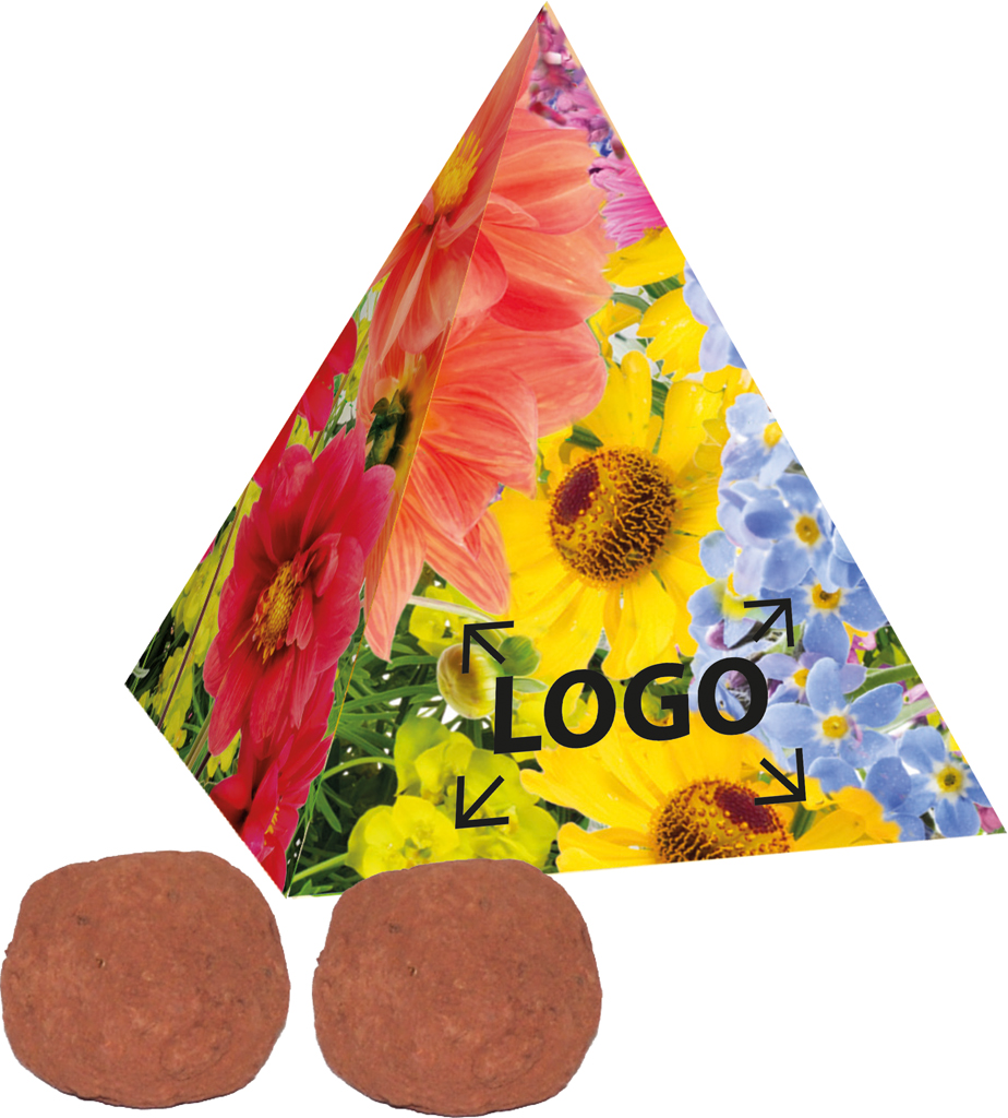 Beschreibung: Die zwei Tonkugeln mit Samenfüllung Bunte Blumenmischung garantieren Spitzenwachstum. Einfach auf Blumenerde legen und wässern. Eine eigene Gestaltung der Pyramide ist ebenfalls ab 250 Stück möglich.