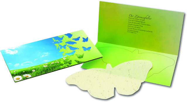 Beschreibung: Der Schmetterling enthält bereits Samen für eine Blumenwiese. Einfach auf das Erdreich legen, mit etwas Erde bedecken und gießen. Schon nach wenigen Tagen sprießen die ersten Keimlinge. Das Standardmotiv der Klappkarte bietet viel Platz für den Werbeeindruck ab 250 Stück. Eine eigene Gestaltung der Karte ist bereits ab einer Bestellmenge von 250 Stück möglich. Ein Kuvert ist separat erhältlich, Artikel 6101