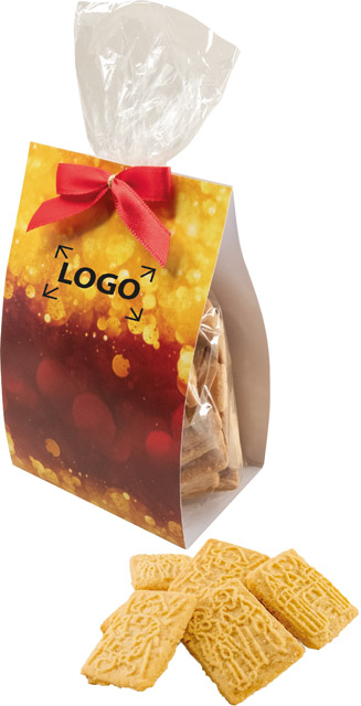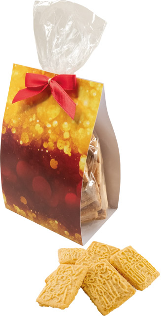 Beschreibung: Im transparenten Beutel befinden sich ca. 100 g leckere und hochwertige Butterspekulatius. Ein süßes weihnachtliches Giveaway über das sich Ihre Kunden freuen werden. Die Banderole bietet viel Platz für Ihren Werbeeindruck oder, ebenfalls ab 100 Stück, für eine individuelle Gestaltung.