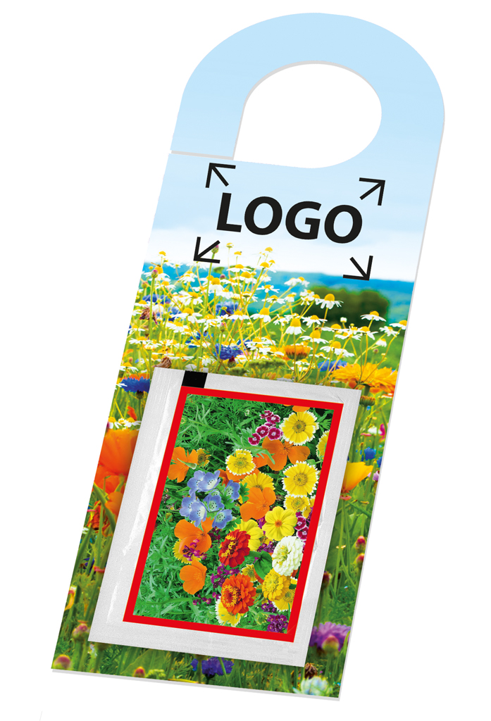 Beschreibung: Heißen Sie Ihre Gäste mit einem wachsenden Blumengruß willkommen. Wenn die Samen des Türanhängers ausgesät sind und anfangen zu wachsen, weckt dieser kleine Willkommensgruß wieder die Erinnerung an den schönen Besuch. Als Werbefläche (ab 250 Stück) steht das Standardmotiv zur Verfügung. Eine eigene Gestaltung des Türanhängers ist ebenfalls ab 250 Stück möglich.