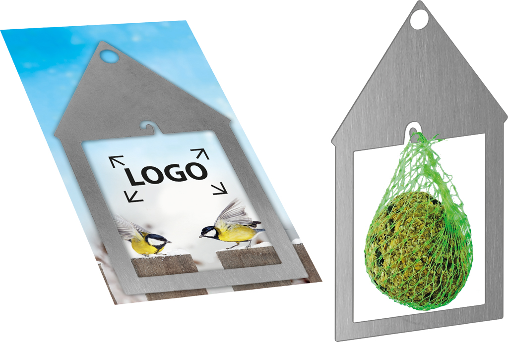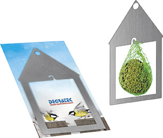 Beschreibung: Ein kleines aber feines Vogelhäuschen aus Edelstahl. Dieses neuartige Vogelhäuschen benötigt aufgrund seiner Größe kaum Platz. Direkt vor dem Fenster, auf der Terrasse oder dem Balkon kann man die Vögel gut beobachten. Lieferung ohne Meisenknödel. Der Werbedruck erfolgt auf dem Standardmotiv der Karte oder eine eigene Gestaltung, jeweils ab 250 Stück.