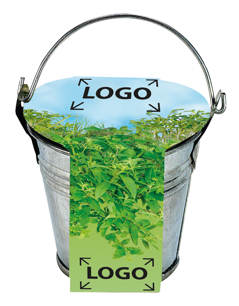 Beschreibung: Das kleine Zinkeimerchen enthält ein Tontöpfchen, Erdtablette und Kräuter-Samen. Ein handliches Giveaway für Ihre wachsende Werbebotschaft. Ihre eigene Gestaltung der Banderole bereits ab 250 Stück.