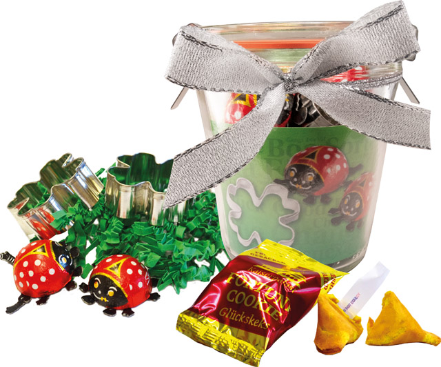 Beschreibung: Das Glücksglas garantiert einen sympathischen Jahresabschluss und einen gelungenen Start in das Neue Jahr. Das Weckglas enthält einen Glückskeks, 2 Ausstechformen Kleeblatt und 2 Glückskäfer aus Schokolade. Platz für den Werbedruck ist auf dem Standardmotiv des Einlegers oder eine eigene Gestaltung, jeweils ab 100 Stück.