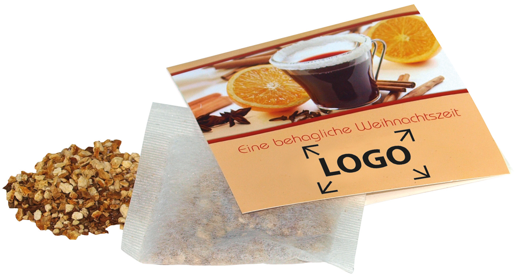 Beschreibung: Mit dieser Zutat ist im Nu ein köstlicher Glühwein zubereitet, ein Genuss in der Winter- und Weihnachtszeit. Das Klappkärtchen enthält 2 g Glühweingewürz in einer transparenten Hülle. Platz für den Werbedruck ist auf dem Standardmotiv der Karte oder eine eigene Gestaltung, jeweils bereits ab 250 Stück.