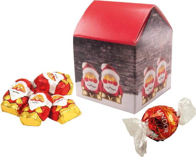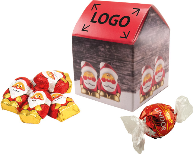 Beschreibung: Unser süßes Weihnachtshäuschen ist ideal als Giveaway in der Adventszeit. Die Lindt Schoko-Kugel und die Schoko-Weihnachtsmännchen sind immer willkommen. Ihre Werbebotschaft kann im Standardmotiv platziert werden. Eine individuelle Gestaltung ist ebenfalls ab 250 Stück möglich.