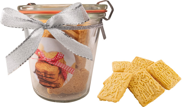 Beschreibung: Das nachhaltige Weckglas, gefüllt mit hochwertigen Butter-Spekulatius, kann auch als Backform oder als Behältnis für Backzutaten verwendet werden. Ihr Werbeeindruck oder eine individuelle Gestaltung des Etiketts ist ab 100 Stück möglich.