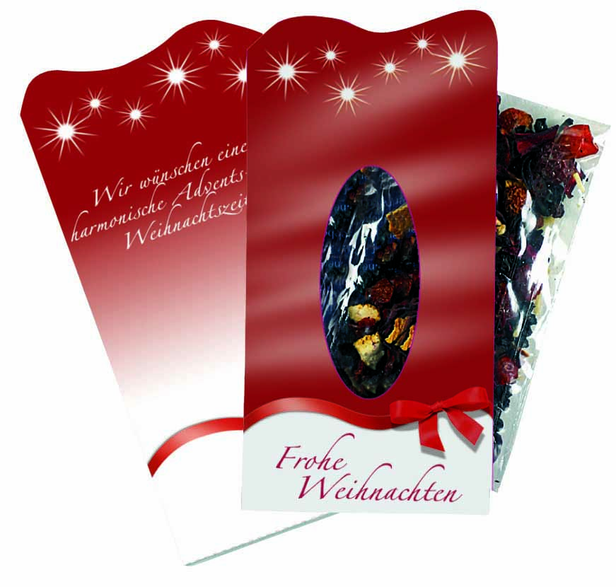 Beschreibung: Dieser köstliche Weihnachts-Früchtetee ist an langen Winterabenden immer eine Bereicherung. Das Teepäckchen enthält ca. 10 g Weihnachts-Früchtetee für ca. 5 Tassen. Platz für den Werbedruck ist auf dem Standardmotiv der Banderole oder eine eigene Gestaltung, jeweils ab 500 Stück.