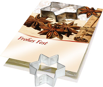 Inhalt: Ausstechform Stern ca. 5 cm, Rezept auf Karte (ohne Gebäck)
