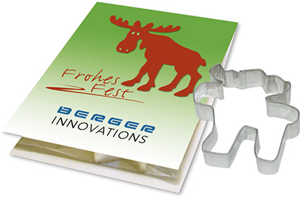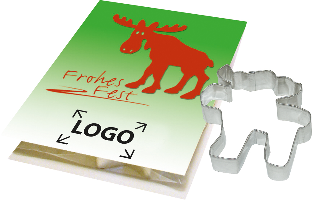 Beschreibung: Ein nettes und nützliches Giveaway für die Adventszeit und zu Weihnachten. Dieses kleine Kärtchen beinhaltet eine Elch-Ausstechform, die jedes Jahr wieder verwendet werden kann. Ein passendes Rezept befindet sich auf der Rückseite der Karte. Platz für den Werbedruck ist auf dem Standardmotiv der Karte oder eine eigene Gestaltung des Kärtchens, jeweils bereits ab 250 Stück.