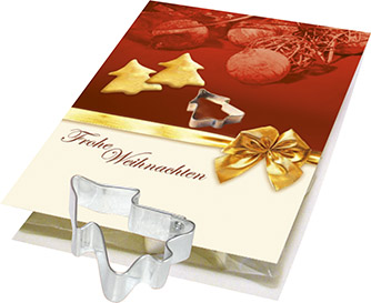 Beschreibung: Ein nettes und nützliches Giveaway für die Adventszeit und zu Weihnachten. Dieses kleine Kärtchen beinhaltet eine Weihnachtsbaum-Ausstechform, die jedes Jahr wieder verwendet werden kann. Ein passendes Rezept befindet sich auf der Rückseite der Karte. Platz für den Werbedruck ist auf dem Standardmotiv der Karte oder eine eigene Gestaltung des Kärtchens, jeweils bereits ab 250 Stück.