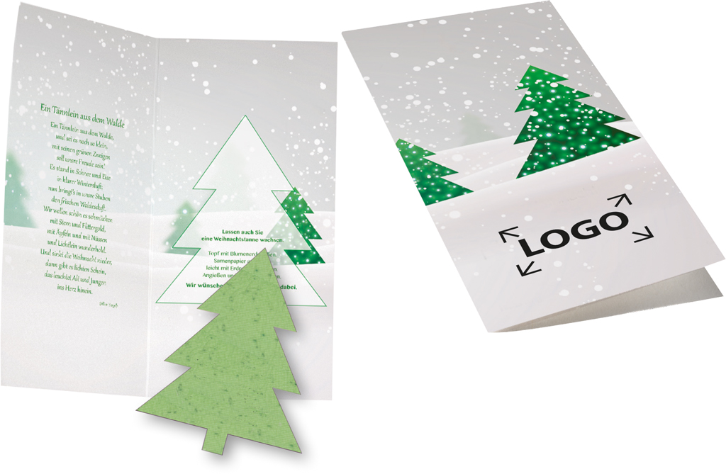 Beschreibung: Der Tannenbaum enthält bereits Fichtensamen. Einfach auf das Erdreich legen, mit etwas Erde bedecken und gießen. Schon nach wenigen Tagen sprießen die ersten Keimlinge. Ab 100 Stück ist Ihre Werbebotschaft auf dem Standardmotiv oder die individuelle Gestaltung der Karte möglich. Ein Kuvert ist separat erhältlich, Artikel 6101