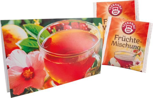 Description: The folding card contains two handy tea bags with fruit blend. Whether as a hot cup for relaxing moments or a fruity refreshment as iced tea: with an intense flavour, bright colour and natural sweetness – completely free from additives. Your advertising on the standard design of the card or a personalisation starts with 250 pieces.