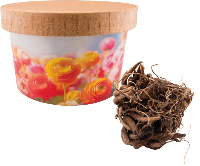 Description: The ranunculus unfolds its full blossom beauty in the natural kraft paper cup, adding vibrant colour and fresh charm to any garden or balcony. Showcase your advertising message on the band – with your logo or a personalised design, available from 250 pieces.