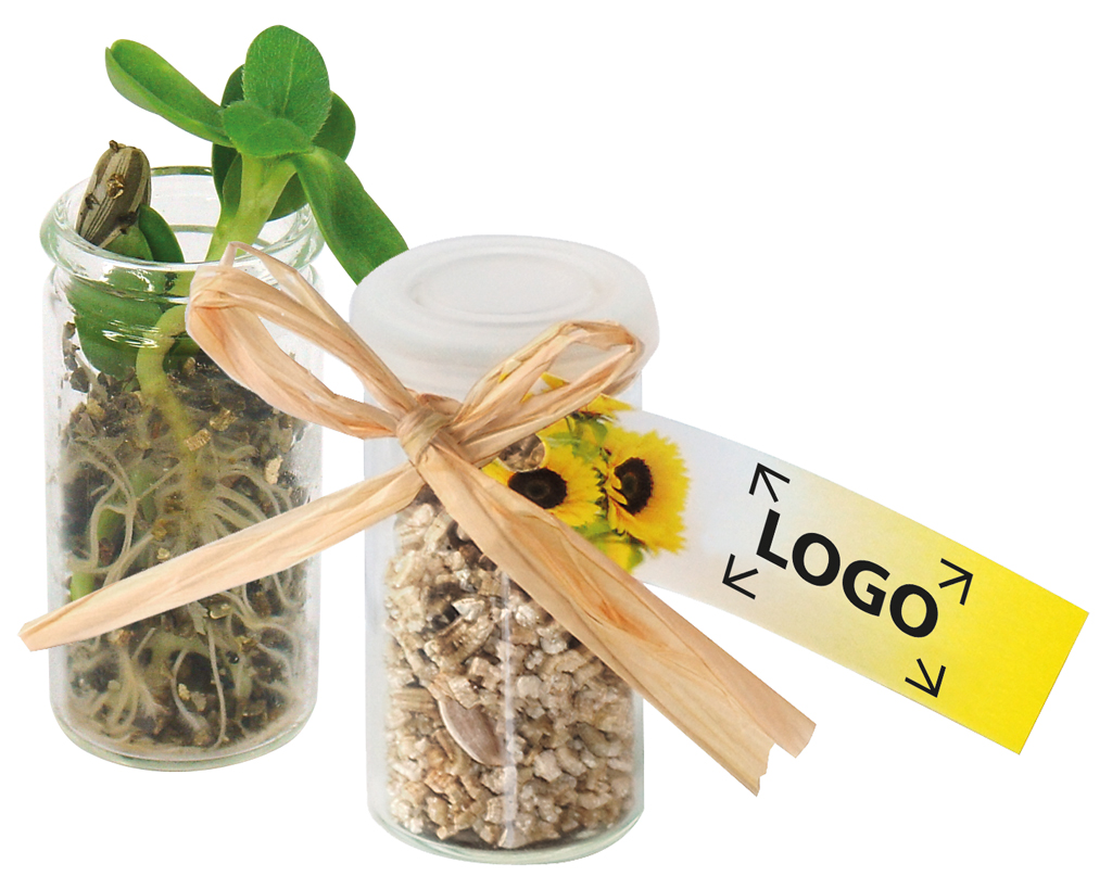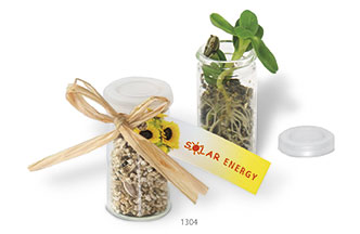 Description: A miniature greenhouse that can be placed even on your desk or on the windowsill. The glass jar contains special granulate and seeds. On the attached card you will find the instructions. The front is intended for your advertising. Your personalisation of the card starts with 250 pieces.