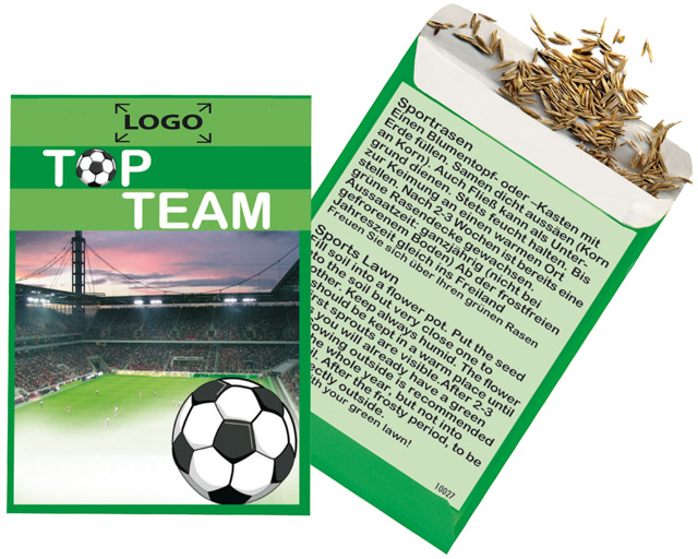 Description: A small football field is growing here. Place the seeds on the soil, cover them with a bit of earth, and water them. After just a few days, the first green shoots will appear. Your personalisation of the seedbag starts with 1.000 pieces.