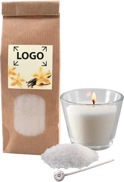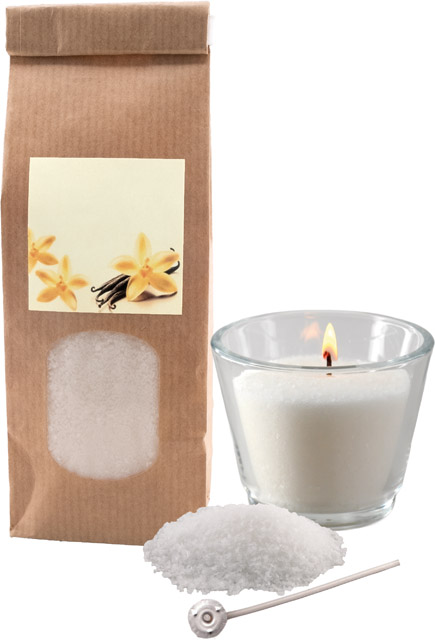 Description: L'agréable parfum de vanille crée une ambiance douillette pendant la saison froide. Il suffit de verser les granulés de cire dans un récipient résistant à la chaleur, de placer la mèche fournie au centre et de l'allumer. Un marquage publicitaire sur le motif standard de l'étiquette ou une personnalisation est possible à partir de 250 exemplaires.